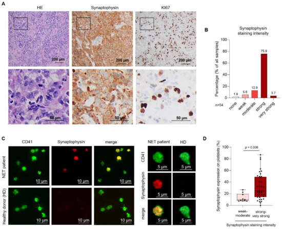 Synaptophysin (Syn) mediates several roles in synaptic functions including synaptic formation, exo- or endocytosis of neuroendocrine cells [25]. Beyond that, synaptophysin serves as a well-established marker protein with a high sensitivity and specificity for NENs [9]. To validate synaptophysin as a tissue marker of NENs, we first stained neuroendocrine tumors of 54 patients. In our cohort of 54 NENs, synaptophysin was expressed in 98.15% of all cases (53 patients) (Figure 1A). In 94.4% of all samples (51 patients), synaptophysin staining intensity was moderate, strong, or very strong (Figure 1B). Weak staining was seen in three patient samples. It has been described that tumor cells interact with platelets via an active transfer of tumor-specific molecules to platelets [26]. We therefore hypothesized that platelets, derived from patients with neuroendocrine malignancies, might express distinct levels of tumor-specific surface proteins like synaptophysin. In a first step, we performed immunofluorescence analysis of platelets derived from patients with histologically confirmed NEN and healthy donors (HD). Platelets were identified by the platelet integrin IIb (CD41). In several platelets, derived from NEN patients, we observed a relevant synaptophysin expression. In contrast, platelet samples from HD showed no relevant staining for synaptophysin (Figure 1C). Remarkably, compared to patients displaying a weak to moderate staining intensity in the tumor, patients showing a strong or very strong synaptophysin staining displayed higher pSyn level (Figure 1D).