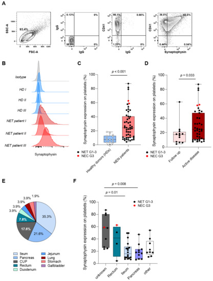 Characterization of pSyn in NEN patients and HD. (A) Gating strategy used to analyze pSyn expression on platelets ex vivo using flow cytometry. (B) Representative results for pSyn expression obtained from patients (n = 3) and HDs (n = 3) are shown. (C) pSyn expression of 20 HD and 51 NEN patients in the PoP cohort is shown. (D) pSyn expression levels in NEN patients receiving follow-up care and active disease. (E) Primary tumor origins of the NEN PoP cohort (n = 51). (F) pSyn expression in accordance to primary tumor origin.