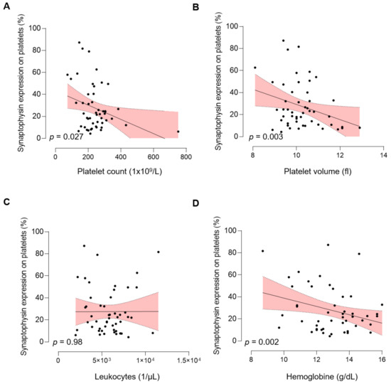 Association of pSyn with hematological parameters. (A) Correlation of pSyn expression and platelet count, platelet volume (B), leukocyte count (C), and hemoglobin concentration (D). Line indicates linear regression, gray area 95% CI interval.