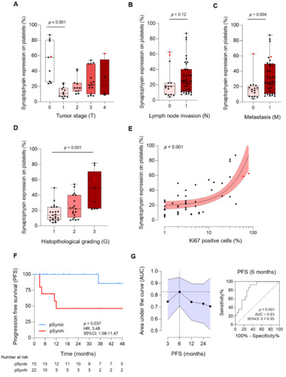 Nevertheless, our study has some limitations. Since several tumor characteristics are largely dependent on each other, it is difficult to assign pSyn to a pathophysiological context based on our data. In order to evaluate the role of pSyn in NEN more independently, we additionally calculated a multivariable model to predict pSyn (p < 0.001, R2 = 0.629). In this model only, grading (p = 0.032) and metastasis (p = 0.005) added statistical significance to our prediction model. However, the small number of patient samples used in our study has to be taken into account. Even if further work is definitively required to understand the relationship between pSyn and tumor progression in NEN, one might speculate that higher tumor burden promotes platelet tumor cell contact in vivo. As a result, certain processes like trogocytosis, i.e., transfer of membrane molecules between tumor cells and platelets, might contribute to explain the observed phenomena [42]. Supporting this hypothesis, we observed a positive correlation of activated platelets and pSyn levels in our cohort. To finally justify pSyn as a dynamic and predictive biomarker in NEN, and to analyze the relationship of pSyn and progression from NET G1/G2 to NET G3 or a presumed high-grade progression from NET G3 to NEC, which is still controversial, sequential pSyn analysis in a larger prospective NEN cohort is additionally needed. Of note, since our study only contains two NEC patients, this study cannot provide any evidence on the relationship of pSyn and tumor progression in NEC.
