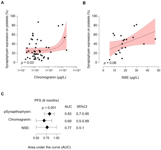 Finally, we comparatively analyzed pSyn with NSE and CgA, two markers routinely determined in NET. Interestingly, we observed a positive correlation of pSyn and CgA levels (p = 0.03, Figure 5A) and pSyn tended to be positively correlated with NSE; however, this trend was not statistically significant (p = 0.06, Figure 5B). Remarkably, the accuracy of pSyn (AUC 0.83, 95%CI: 0.7–0.95, p < 0.001) to predict PFS was superior compared to CgA (AUC 0.69, 95%CI: 0.5–0.89, p = 0.074) and NSE (AUC 0.77, 95%CI: 0.5–1, p = 0.041) (Figure 5C). In conclusion, these data highlight the potential of pSyn as a novel predictive liquid biomarker in NEN.