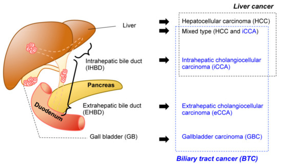 The biliary system is a network of bile ducts that collect bile produced and secreted by hepatocytes in the liver. The bile ducts merge into the common bile duct (CBD), transporting bile to the duodenum, where it aids the absorption of dietary lipids in the intestine. The gall bladder (GB) is located in the middle of this network. It functions to temporally store bile during the fast state, which in turn is secreted by GB contraction upon food intake. Biliary tract cancer (BTC) is a malignant tumorous cancer that arises from epithelial cells that cover the lumen of the bile duct. It is typically divided into three subtypes (Figure 1) based on anatomical site: intrahepatic cholangiocarcinoma (iCCA), extrahepatic cholangiocarcinoma (eCCA), and gallbladder carcinoma (GBC). While the histological diagnosis for most BTCs is adenocarcinoma, a subset of liver cancer is a biphasic tumor comprising both iCCA and hepatocellular carcinoma (HCC), thereby diagnosed as mixed type [1].