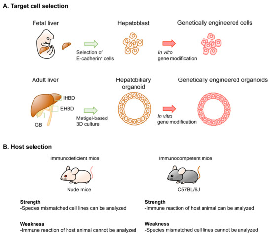 To model iCCA, orthotopic implantation of genetically modified cells into the peripheral intrahepatic bile duct can be achieved by injection, either directly into the capsule of the liver [18,95] or indirectly into the spleen to allow cells to reach the liver via the splenic vein and engulf in the peripheral Glisson capsule. Syngeneic immunocompetent mice are usually selected as hosts for orthotopic implantation to investigate carcinogenesis in the presence of host-tumor interactions. In several studies, retrorsine and CCl4 were administered to exhaust normal hepatic stem cells and facilitate engulfment of the progenitor population to the host liver [96,97]. No reports have described orthotopic implantation models of eCCA. This might be because the extrahepatic bile ducts, such as the CBD in mouse, are too short and thin to inject organoids mixed with Matrigel.