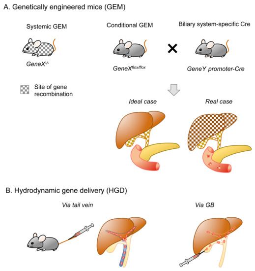 Figure 3. In vivo genetic engineering. (A). Genetically engineered mice (GEM). By crossing conditional GEM for the “gene X” and “gene Y”-Cre mice, which allow biliary system-specific recombination, resultant mice are supposed to be genetically engineered only in the biliary system (left). Note that, in reality, Cre expression could be broader (right). (B). Hydrodynamic gene delivery (HGD). Tail vein injection is the major means of gene delivery, while injection via GB is also reported.