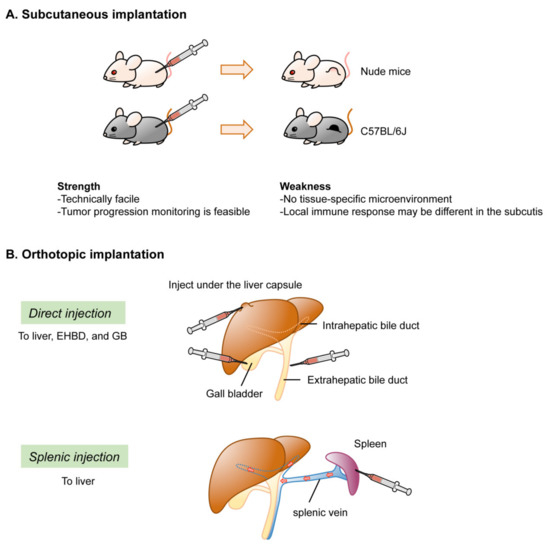In conditional GEM models of BTC, spontaneous tumor development can occur in situ. Depending on the specificity of the Cre strain used, however, the distribution may not be limited to the target organs or cells. In contrast, subcutaneous or orthotopic implantation models can develop tumors at the inoculated site. For iCCA, methods for inoculation of the liver have been well established. However, orthotopic implantation has not yet been established for eCCA. With regard to GBC, only a few studies have reported orthotopic implantation of the GB and resultant tumor development. However, there is an opposing view of the feasibility of orthotopic tumor development by direct inoculation into the GB, and an organoid-based two-step inoculation method was recently established to model orthotopic GBC development [24]. In this subsection, we highlight the technical aspects and limitations of the implantation approach (Figure 4).