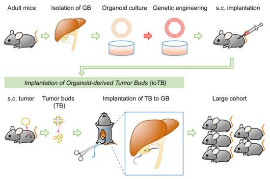 Two methods have been reported for GBC models. One involves injecting transduced GB organoids under the liver capsule [21]. This may be difficult to regard as an orthotopic injection in a strict sense, although human GBC often invades the liver during progression. The other method involves injecting human [98,99] or mouse cells [23] directly into the lumen of the GB. However, this procedure can readily allow cells to pass through the bile duct to the Vater papilla into the duodenum. If cells are resuspended in a liquid and injected locally, there is always a risk of leakage from the injection site to the peritoneal cavity, which makes it difficult to distinguish from metastatic disease. To address these issues, a novel two-step model was recently documented for GBC. Transduced organoid-derived subcutaneous tumors in syngeneic mice were subjected to orthotopic implantation, as fragmented “tumor bud.” This approach, termed implantation of organoid-derived tumor buds (IoTB), enabled the establishment of a fine GBC model without injection-associated cell leakage [24].