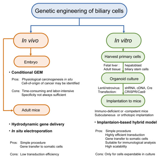 Genetic engineering and gene editing can be conducted both in vivo and in vitro. However, systemic gene targeting can result in embryonic lethality or developmental anomalies in knockout mice. In addition, even if pups are born viable and healthy, tumor development in other organs may occur earlier than precede that in the organs of interest, thereby limiting the analysis of tumor development in the right target. To address these issues, gene targeting in a spatiotemporally regulated manner by applying Cre-LoxP technology to mice carrying floxed alleles has become the standard platform for GEM. More recently, CRISPR/Cas9 technology, in situ electroporation, and hydrodynamic gene delivery (HGD) have also been applied to the biliary system (Figure 3). Various combinations of these modalities have further extended the diversity of BTC modeling, although these approaches are limited.