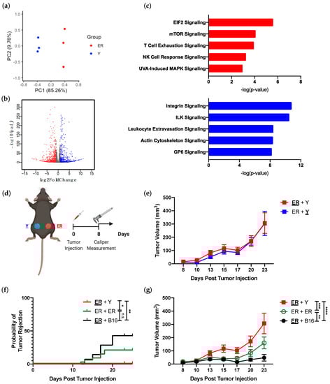 YUMMER (ER) and YUMM (Y) cell lines have different transcriptomes in vitro and establish synchronous melanoma tumors in vivo. (a) PCA plot separating overall transcriptomic differences between ER and Y cell lines in vitro. Notice how the two cell lines generate distinct groupings along the PC1 axis. (b) Volcano plot highlighting differentially expressed genes in ER (red) vs. Y (blue) cell lines. Colored genes are statistically significant with adjusted p-value < 0.05 and log 2-fold change > |1|. (c) Top-most upregulated pathways in ER and Y cell lines as identified by IPA analysis. Red bars indicate pathways upregulated in ER and blue bars indicate pathways upregulated in Y cells. (d) Synchronous murine melanoma model schematic. The analyzed tumor in the synchronous model is underlined and bolded in subsequent figures. A table of tumor combination can be found in Supplementary Table S1. (e) Growth curves of individual ER (ER + Y) and Y (ER + Y) tumors in synchronous melanoma mice. (f) Percent of ER tumors rejected and growth curve (g) of synchronous ER tumors from ER + Y, ER + ER, and ER + B16 mice. Data (mean ± SEM) in (e–g) are pooled, from 3–5 mice/group/experiment, and representative of at least 2 independent experiments. * p < 0.05, ** p < 0.01, *** p < 0.001, **** p < 0.0001, n.s. not significant.