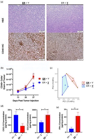 Synchronous YUMMER (ER) and YUMM (Y) tumors establish distinct TIME in vivo. (a) Representative H&E histology and CD45 IHC of synchronous ER (ER + Y) and Y (ER + Y) tumors on day 27. (b) Number of infiltrating CD45+ immune cells over time in synchronous ER (red) and Y (blue) tumors. N = 3–5 mice per time point. (c) PCA plot from Luminex analysis of 25 different chemokines/cytokines of synchronous ER and Y tumors on day 27. Concentrations of intratumoral CCL5, CXCL12 (d) and IFN-γ (e) in synchronous ER and Y tumors isolated from synchronous melanoma mice on day 27. Data (mean ± SEM) in (c–e) are pooled, from 2–3 mice/group/experiment, and are representative of at least 2 independent experiments. * p < 0.05, ** p < 0.01. H&E (hematoxylin and eosin); IHC (immunohistochemistry); IFN-γ (interferon-gamma).