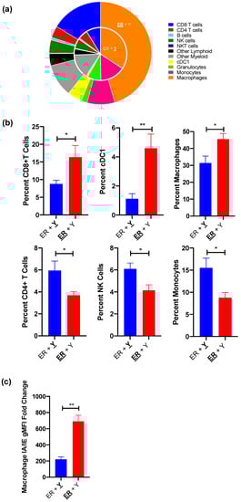Synchronous YUMMER (ER) and YUMM (Y) TIMEs contain different immune cell infiltrations by day 27 post tumor implantation. (a) Nested pie charts demonstrating distributions of various CD45+ immune cell subsets in synchronous ER (ER + Y) and Y (ER + Y) tumors with Y tumor as the inside pie and ER tumor the outside pie. (b) Synchronous ER (red) tumors have increased percentages of CD8+ T cell, cDC1 and macrophage infiltration, whereas synchronous Y (blue) tumors have increased CD4+ T cell, NK cell and monocyte infiltration. (c) The geometric mean fluorescence intensity (gMFI) of the surface MHC Class II I-A/I-E molecule is higher in synchronous ER tumors compared to Y tumors after normalization to unstained cells. Data (mean ± SEM) in (a,b) are pooled from 3–5 mice/group/experiment and representative of at least two independent experiments. The gating schematic for (b) is shown in Supplementary Figure S3. Data (mean ± SEM) in (c) are pooled from 3–5 mice/group. * p < 0.05, ** p < 0.01. TIME (tumor immune microenvironment); NK (natural killer); cDC1 (dendritic cell type 1); MHC (major histocompatibility complex).