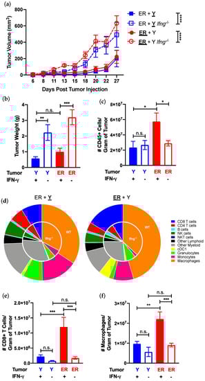 IFN-γ presence influences synchronous YUMMER (ER) and YUMM (Y) tumor growth and establishment of TIME. (a) Growth curves of individual ER (ER + Y, red) and Y (ER + Y, blue) tumors in the synchronous melanoma model in wildtype and Ifng−/− mice. (b) Tumor weight and (c) frequency of tumor-infiltrating CD45+ immune cells per gram of tumor assessed on day 27. (d) Immune cell type distribution in synchronous ER (ER + Y) and Y (ER + Y) tumors shown as nested pie charts with inner pie representing percentages found in Ifng−/− mice and outer pie representing wildtype mice. Frequency of tumor-infiltrating CD8+ T cells (e) and macrophages (f) on day 27 of individual tumors in wildtype and Ifng−/− synchronous mice. Data (mean ± SEM) in (a,b) are pooled, from 3–8 mice/group from two independent experiments. Data (mean ± SEM) in (c–f) are pooled from 3–5 mice/group/experiment and representative of at least two independent experiments. Gating schematic for (d) shown in Supplementary Figure S3. * p < 0.05, ** p < 0.01, *** p < 0.001, **** p < 0.0001, n.s. not significant. TIME (tumor immune microenvironment); IFN-γ (interferon-gamma); NK (natural killer); cDC1 (dendritic cell type 1).