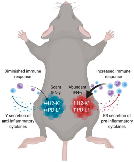 The following are available online at https://www.mdpi.com/article/10.3390/cancers13102293/s1, Table S1: Tumor legend notation, Figure S1: Heatmap of intratumoral cytokines/chemokines, Figure S2: Heatmap of key differentially expressed genes in Y vs. ER cells in vitro, Figure S3: Gating scheme for flow cytometric analysis of tumor-infiltrating immune subsets, Figure S4: Percentages of tumor-infiltrating CD8+ T cells and macrophages in synchronous Y and ER tumors of wildtype and Ifng−/− mice, Figure S5: Normalized geometric MFI of surface H2-Kb and PD-L1 on Y and ER cells cultured with exogenous IFN-γ in vitro.