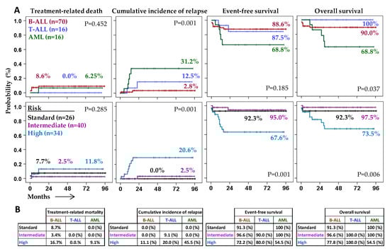Patient outcome according to the type of acute leukemia and the risk status at enrollment. (A) Kaplan–Meier and log-rank tests for cumulative incidence of relapse, treatment-related mortality, event-free survival (EFS), and overall survival (OS) according to the type of acute leukemia (B-ALL, T-ALL, or AML) and the risk status at enrollment. (B) Rates (%) of cumulative incidence of relapse, treatment-related mortality, EFS, and OS according to the risk status of patients at diagnosis for each type of leukemia. Primary data can be consulted in File S1.