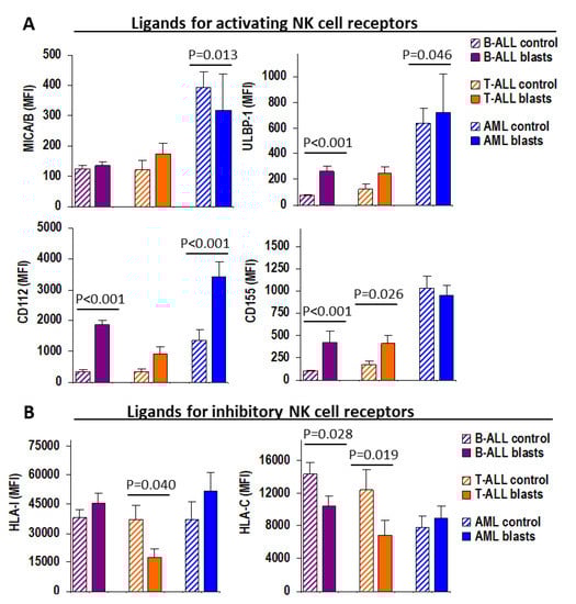 Expression of ligands for NK cell receptors on leukemic blast cells. (A) Mean fluorescence intensity (MFI) expression on normal counterpart cells (control, striped bars) and leukemic blast cells (solid bars) of ligands for activating NK cell receptors MICA/B and ULBP (ligands of NKG2D) and CD112 and CD155 (ligands of DNAM-1/CD226). (B) Expression of HLA-I and HLA-C ligands for inhibitory receptors (iKIRs and NKG2A). See Figure 7 for details of MFI estimation in leukocyte subset.