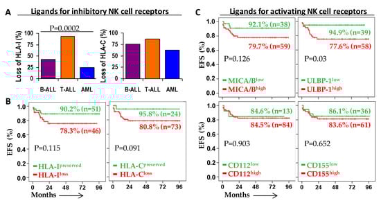 Event-free survival (EFS) of patients according to the expression of ligands for NK cell receptors. (A) Frequency of HLA-I and HLA-C loss in B-ALL, T-ALL and AML patients. HLA loss was computed when the mean fluorescence intensity (MFI) expression of HLA on leukemic blast cells was lower than that observed on the normal counterpart cells. P estimated with the Chi-squared test. (B) Kaplan–Meier and log-rank tests for EFS of acute leukemia patients according to the low or high expression of ligands for activating NK cell receptors MICA/B (ROC, AUC = 0.53, cutoff = 108.5, sensitivity = 80.0, and specificity = 51.0), ULBP-1 (ROC, AUC = 0.60, cutoff = 140.1, sensitivity = 86.6%, and specificity = 60.1%), CD112 (ROC, AUC = 0.55, cutoff = 1640, sensitivity = 66.0%, and specificity = 55.0%) and CD155 (ROC, AUC = 0.54, cutoff = 326.1, sensitivity = 56.0, and specificity = 62.2). (C) Kaplan–Meier and log-rank tests for EFS of acute leukemia patients according to the loss or preservation of HLA-I and HLA-C.