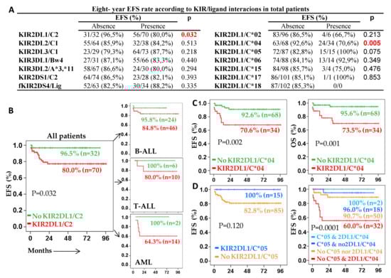 Finally, we evaluated the impact of KIR/HLA-I ligand interactions in the outcome of acute leukemia patients. Specifically, only the presence of the KIR2DL1/C2-ligand interaction was associated with lower 5y-EFS rates (80.0% vs. 96.5%, p = 0.032) in total patients (Figure 4A left, B), as well as in B-ALL (84.8% vs. 95.8%, n.s.), T-ALL (80.0% vs. 100%, n.s.) and AML (64.3% vs. 100%, n.s.) (Figure 4B). To clarify the role of this interaction, we subsequently analyzed the interaction of KIR2DL1 with each of the HLA-C allotypes included in the C2-epitope group (HLA-C*02, *04, *05, *06, *15, *17, *18) (Figure 4A right). It was noteworthy that specifically KIR2DL1/HLA-C*04 interaction was associated with the most reduced 5y-EFS rate (70.6% vs. 92.6%, p < 0.002) and 5y-OS rate (73.5% vs. 95.6%, p = 0.001) in all patients (Figure 4C). Furthermore, KIR2DL1/HLA-C*04 interaction was associated with a higher rate of relapse (17.6% vs. 4.4%, p = 0.035) compared to patients without this interaction. Patients with the KIR2DL1/HLA-C*04 interaction showed the most reduced 5y-EFS rates also in B-ALL (77.3% vs. 93.8%, p = 0.036), T-ALL (75.0% vs. 91.7%, n.s.) and AML (50.0% vs. 87.5%, p = 0.05) patients. Apparently, the KIR2DL1/HLA-C*05 interaction was associated with a better 5y-EFS rate (100% vs. 82.8%), neutralizing the negative impact of KIR2DL1/HLA-C*04 interaction. Thus, only in the absence of HLA-C*05, KIR2DL1/HLA-C*04 interaction showed the most reduced 5y-EFS rate (60.0%, p = 0.0001) compared to that of patients with the KIR2DL1/HLA-C*04 interaction in the presence of HLA-C*05 (100%) or to those without the KIR2DL1/HLA-C*04 interaction whether (96.0%) or not (90.7%) patients were HLA-C*05 (Figure 4D).
