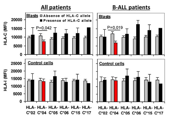 Trying to understand why KIR2DL1/HLA-C*04 interaction could be associated with a much lower EFS and OS, the expression of total HLA-I and HLA-C was analyzed on leukemic blast cells of patients carrying the 6 different allotypes with the C2-epitope. Remarkably, only patients with the HLA-C*04 allotype, compared to patients with other C2-epitope allotypes, showed a significant reduction in HLA-C expression on leukemic cells (7391 ± 1046 vs. 10,765 ± 1240 MFI, p = 0.042), but not of HLA-I (13,163 ± 1611 vs. 13,733 ± 1492 MFI, n.s.). The other HLA-C allotypes with the C2-epitope showed maintained or increased expression of HLA-C. Similar results were observed when patients with B-ALL were analyzed independently, with patients who carried the HLA-C*04 allotype showing a significant reduction in HLA-C expression (6903 ± 1412 vs. 12,026 ± 1581 MFI, p = 0.019) compared to patients with other C2-epitope allotypes (Figure 5).