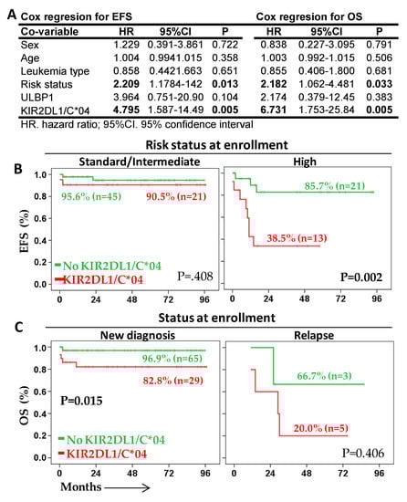 KIR2DL1/C*04 interaction is an independent prognostic biomarker. (A) Cox regression analysis for PFS and OS for sex, age, type of leukemia, risk status at enrollment, low/high expression of ULBP-1, and presence/absence of the KIR2DL1/C*04 interaction. (B) Kaplan–Meier and log-rank tests for EFS according to the presence/absence of KIR2DL1/HLA-C*04 interaction in standard/intermediate and high-risk patients. (C) Kaplan–Meier and log-rank tests for OS according to the presence/absence of KIR2DL1/HLA-C*04 interaction in patients enrolled because of new diagnosis or relapse.