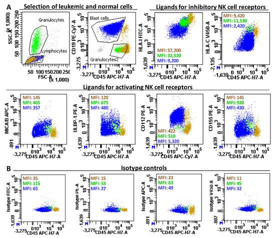 Immunophenotype analysis of NK cell receptor ligands in normal and leukemic bone marrow cells. (A) Events with low/intermediate dispersion in FSC/SSC, including residual normal lymphocytes (brown dots) and leukemic blast cells (blue dots), were gated in an FSC/SSC dot plot. Leukemic cells were gated in a plot with CD45-APCCy7 combined with CD19-PECy7 for B-ALL, CD7-PECy7 for T-ALL or CD34-PECy7 or CD33-PECy7 for AML. Granulocytes (green dots) were identified with gates on high SCC in the FSC/SSC dot plot and low CD45 in the CD45-APCCy7/PECy7 dot plot. Mean fluorescence intensity (MFI) was evaluated for CD112, CD155, and ULBP-1 in the PE-channel, for MICA/B in the APC-channel, for HLA-I in the FITC-channel, and for HLA-C in the V450 (VB421) channel on lymphocytes, granulocytes, and blast cells. Dot-plots correspond to a representative case with a clear expression loss of HLA-I and HLA-C and strong gain of CD112, with a moderate gain of MICA/B, ULBP-1, and CD155. (B) MFI in the FITC, PE, APC, and V450 (BV421) channels were also estimated for leukocyte subsets in the isotype tube to determine the background of each fluorescence.