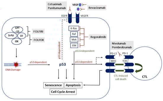 In the treatment of metastatic CRC (mCRC), monoclonal antibodies which target signaling cascades of p53 mutants could boost standard chemotherapy regimens (Figure 1). In this vein, biologicals such as Bevacizumab (anti-VEGF, anti-vascular endothelial growth factor) or Cetuximab and Panitumumab (anti-EGFR, anti-epidermal growth factor receptor) are used in combination with standard regimes (only in wt-RAS mCRC for EGFR antibodies). Both pathways, VEGF and EGFR, have significant implications in promoting tumor angiogenesis and cell growth, and the combination of agents targeting these pathways with chemotherapy can enhance clinical response rates []. However, KRAS mutational status and the tumor site (right-sided or left-sided) were shown to predict treatment response in patients receiving EGFR-targeted therapy. In right-sided colon cancer specifically, anti-EGFR therapy is currently not recommended []. Although in-vitro studies have highlighted higher VEGF expression in colon cells with p53 dysfunction [], the impact of such mutations still remains unclear. A retrospective analysis of 161 patients with mCRC revealed that anti-VEGF-based therapy was superior in relation to OS compared with anti-EGFR-based therapy in p53 mutated tumors, while there was no difference in wt-p53 tumors []. An earlier study did not report a significant association of p53 overexpression or mutations in patients treated with Bevacizumab in addition to Irinotecan, 5-FU and LV with respect to survival []. Similar results were seen in patients from the CAIRO2 study (randomized phase III study of Capecitabine, Oxaliplatin and Bevacizumab with or without Cetuximab in first-line advanced colorectal cancer). The retrospective analysis of KRAS and TP53 mutation status in this study cohort revealed no impact on PFS and OS []. Bevacizumab is known to induce cellular senescence in CRC cells, which appears to be independent of p53 status []. This supports most of the clinical data, that p53 is not predictive of treatment response to anti-VEGF targeted therapies. However, if p53 seems to have no potential impact on treatment with anti-VEGF biologicals, patients may benefit from adding them to chemotherapy regardless of the p53 mutational status.