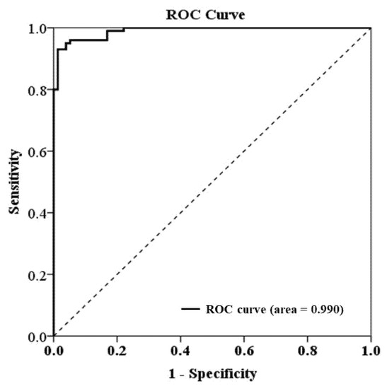 The ROC curve (receiver operating characteristic curve), ampullary cancer (study group) vs. healthy volunteers (normal control).