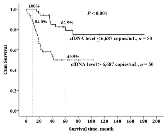 A blood sample was collected from each patient with written informed consent before surgery and stored in the Biobank of Taipei Veterans General Hospital. All blood samples were anonymous in our biobank. The cfDNA from each Biobank plasma sample was determined using a commercial QIAamp DNA Tissue Kit and MinElute Virus Kit (Qiagen, Valencia, CA, USA) according to the manufacturer’s instructions. The quality and quantity of plasma DNA were evaluated using a Nanodrop 1000 Spectrophotometer (Thermo Fisher Scientific, Waltham, MA, USA). A TaqMan quantitative polymerase chain reaction (qPCR) assay (Thermo Fisher Scientific) of the housekeeping gene cyclophilin, which was not known to be correlated with cancer, was used to quantify the cfDNA copy numbers in the plasma samples. qPCR was performed using TaKaRa Ex Master Mix (Takara Bio, Shiga, Japan) according to the manufacturer’s instructions. The sequence of cyclophilin primers were as below: forward ACATGGGTACTAAGCAACAAAATAAG and reverse CACAATTGGAACATCTTTGTTAAAC. The probe primer was Fam-TTGCAGACAAGGTCCCAAAGACAGCA-Tamra. Serially diluted standard DNA was used to generate a standard curve. The results were expressed as the threshold cycle (Ct), which was the cycle number at which the PCR product crossed the threshold of detection. To reduce the batch effect, we prepared a large volume tube of pre-mixed plasma samples (20 mL pooled from multiple samples) and prepared small aliquots of the pooled samples in standard tubes (1 mL) for storage at −80 °C. When performing cfDNA extraction and qPCR experiment, we used plasma samples from clinical individuals and the pre-mix standard tube. The cfDNA copy number in each patient was measured according to the Ct value and the standard curve from serially-diluted DNA (0.001, 0.01, 0.1, 1, 10, 100 ng). The results of standard tubes between different batches were used to calculate the batch-effect factor for adjusting the copies/mL value in the following analyses. The batch-effect factor was calculated based on the pre-mix standard plasma cfDNA level. Subsequently, the cfDNA copy number was normalized according to the plasma input volume and the batch-effect factor, and was expressed in copies/mL. The cfDNA levels of 95 healthy volunteers without any history of malignancy were measured at our institute, including 66 males and 29 females with a mean age 54.2 ± 15.5 years. These healthy volunteers had no subsequent diagnosis of malignancy for at least two years after blood sampling. There was no difference in the method of sample collection and DNA isolation between cfDNA samples of healthy volunteers and cancer patients. The samples were all from the same biobank and were all collected in the same type of collecting tube, but not during the same period of time. The PCRs for the cfDNA samples of healthy volunteers and cancer patients were not performed simultaneously because it was impossible to collect the blood samples of healthy volunteers and cancer patients at the same time, but using the same standard.