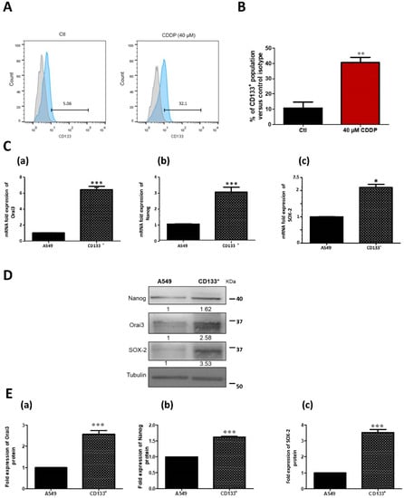 - Bertolini, G.; Roz, L.; Perego, P.; Tortoreto, M.; Fontanella, E.; Gatti, L.; Pratesi, G.; Fabbri, A.; Andriani, F.; Tinelli, S.; et al. Highly Tumorigenic Lung Cancer CD133+ Cells Display Stem-like Features and Are Spared by Cisplatin Treatment. Proc. Natl. Acad. Sci. USA 2009, 106, 16281–16286. [Google Scholar] [CrossRef] [PubMed]