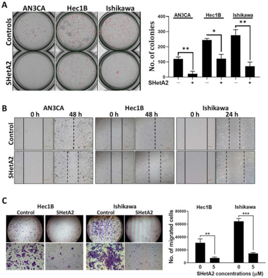 SHetA2 attenuates cancerous phenotypes of endometrial cancer cell lines: (A) Soft agar colony formation assay of endometrial cancer cells treated with 5 µM SHetA2 or vehicle. After 3 weeks of culture, colonies were imaged (left panel) and counted (right panel) using q GelCount colony counter. Representative images scanned at 4× magnification are shown. The controls were set as 100% and data are shown as mean ± SD. (B) Wound healing scratch assay of endometrial cancer cells treated with 5 µM SHetA2 or vehicle. Images were captured at the indicated time points. (C) Invasion assays were conducted using the Matrigel-coated transwell chamber. Representative images of transwells showing invasion capacity of Hec1B and Ishikawa endometrial cancer cell in the presence of SHetA2 or vehicle are shown (left panel). The number of invaded cells were counted with a cell counter and shown (right panel). * p ≤ 0.05, ** p ≤ 0.01, *** p ≤ 0.001 when compared with respective controls.