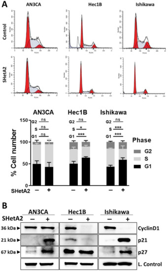 Endometrial cancer cells treated with 5 µM SHetA2 or vehicle for 24 h were trypsinized, collected and washed with PBS. The cell suspension was fixed in 100% ethanol and incubated on ice for 20 min. Afterwards, the fixed cells were stained with Propidium Iodide (PI) Staining solution (0.5 μg/mL RNase A, 50 μg/mL PI and 1% Triton X-100) and Flow cytometry was performed using a FACS Calibur Flow Cytometer (BD Biosciences, San Jose, CA, USA).