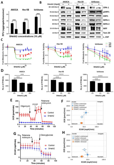 SHetA2 affects endometrial cancer cell mitochondria and metabolism: (A) JC-1 assay (ratio of aggregated JC-1 to monomer JC-1) in endometrial cancer cells treated with SHetA2 (10 µM) or vehicle. (B) Western blot analysis of mitochondrial dynamics-related proteins in endometrial cancer cells treated with or without SHetA2 (10 µM) for 24 h. (C) Metabolic viability of endometrial cancer cells treated with various doses of SHetA2 for 24, 48, and 72 h. The results are shown as % viability as compared to control. (D) ATP assay of endometrial cancer cells treated with SHetA2 (5 and 10 µM) for 24 h. (E) OCR and (F) Energy phenotype of Ishikawa cells treated with SHetA2 (10 µM) or vehicle for 4 h and measured by the Seahorse Cell Mito-Stress Test and the XFe96 Analyzer. (G) Extracellular acidification rate (ECAR) and (H) energy phenotype of Ishikawa cells treated with SHetA2 (10 µM) or vehicle for 4 h and measured with the Seahorse glycolytic rate assay and the XFe96 Analyzer. *** p ≤ 0.001, **** p ≤ 0.0001 when compared with respective control.