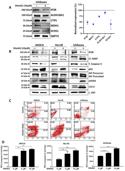 Molecular mechanism of SHetA2: (A) Ishikawa cells were treated with SHetA2 (10 µM) for 4 h and co-immunoprecipitation was performed with mortalin antibody (Grp75)-tagged beads. Western blots (left panel) and densitometry analyses (right panel) was performed for IP3R, ALDH18A1, CTPS, MDH1, and ECHS1 to confirm the reduction of client protein co-immunoprecipitation. (B) Western blot analysis for the protein expression of IP3R, Cl. PARP, total caspase-3, P62, AIF, DNA damage marker (γH2AX) and LC3-II proteins in endometrial cancer cells treated with, or without, SHetA2 (10 µM) for 24 h. (C) Cell apoptosis was detected by Annexin-V/PI combined labeling with flow cytometry in endometrial cancer cells 24 h after treatment with SHetA2 (10 µM) or vehicle. (D) Caspase-3 activity assay for endometrial cancer cells treated with indicated dose of SHetA2 for 24 h. ** p ≤ 0.01, *** p ≤ 0.001, **** p ≤ 0.0001 when compared with respective control.
