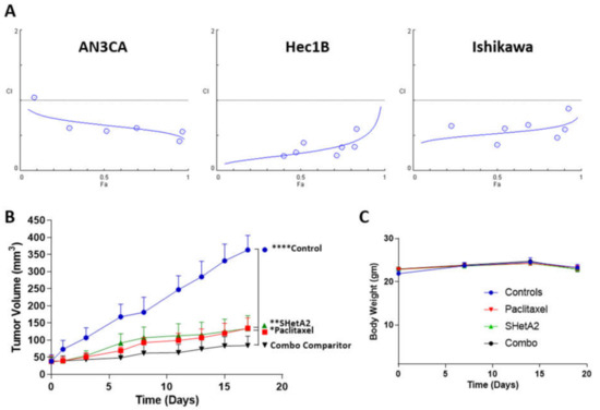To test the feasibility of combining SHetA2 with paclitaxel in treating endometrial cancers, we derived the CI’s of this drug combination using isobologram analysis according to the Chou–Talalay method [57]. SHetA2 and paclitaxel acted synergistically across all fold affect (Fa) combination doses above 0.1 in all three cell lines (Figure 5A). The DRIs derived from these analyses predict that when SHetA2 is combined paclitaxel, the dose of paclitaxel can be reduced by 6.4-fold for AN3CA, 2.4-fold for AN3CA, and 3.5-fold for Ishikawa to achieve the same 0.90 Fa. Given these promising results, we then evaluated the drug combination in mice harboring Ishikawa xenografts and found that each drug as a single agent significantly reduced tumor growth, while the combination was significantly more effective than either drug alone (Figure 5B). Furthermore, none of the drug treatments altered the body weights of the animals in comparison to vehicle treated controls (Figure 5C). These results indicate that SHetA2 and paclitaxel can be combined to increase efficacy without increasing toxicity in an endometrial cancer xenograft model.