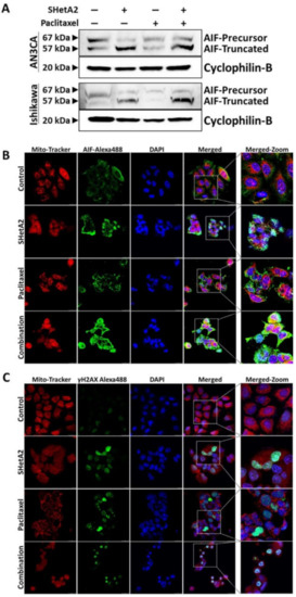 SHetA2 induces nuclear translocation of AIF, while both SHetA2 and paclitaxel induce DNA damage: (A) Western blot analysis for AIF expression in AN3CA and Ishikawa cells treated with SHetA2 or paclitaxel or their combination. (B,C) Representative immunofluorescence images for Mitotracker (red) and AIF (Green, B), or γH2AX (C) show their localization in AN3CA and Ishikawa cells treated with SHetA2 or paclitaxel or their combination. DAPI (Blue) staining was used as nuclear stain. Representative images taken at 63× magnification are shown. The left-most panels represent enlarged pictures of the square boxes shown in merged image.