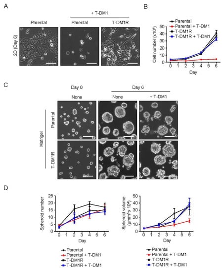 Parental JIMT1 cells were derived from a trastuzumab-resistant, HER2-positive breast cancer patient [14]. In cell culture, these cells do not respond to trastuzumab [15]. As shown in Figure 1A,B, however, parental JIMT1 cells are sensitive to T-DM1 at a dose of 4 µg/mL in conventional two-dimensional (2D) cell culture dishes. Similar results were reported in our previous published paper [12]. We generated T-DM1-resistant JIMT1 cells (T-DM1R) via chronically exposing cells to escalating doses of T-DM1 [12]. To examine whether extrinsic factors or tumor microenvironment can affect the sensitivity of parental JIMT1 cells to T-DM1, the cells were cultured on a Matrigel matrix in the absence or presence of T-DM1 at 4 µg/mL. Matrigel is a basement membrane matrix extracted from the Engelbreth-Holm-Swarm (EHS) mouse sarcoma, and consists of laminin (a major component), collagen IV, heparan sulfate proteoglycans, entactin/nidogen, and a number of growth factors [16,17,18,19]. The Matrigel matrix is widely used as a model of tumor microenvironment [20]. As shown in Figure 1C, both parental JIMT1 and T-DM1R cells displayed different cell morphologies compared to cells cultured on traditional 2D cell culture dishes (compare Figure 1A with Figure 1C). Under the Matrigel system, both parental JIMT1 and T-DM1R cells did not spread but were capable of growing and forming spheroids on the Matrigel matrix (Figure 1C). Surprisingly, both parental JIMT1 cells and T-DM1R cells grew and formed spheroids with similar numbers in the presence of 4 µg/mL T-DM1 on the Matrigel matrix, except that the volumes of parental spheroids were slightly smaller than that of T-DM1R cells (Figure 1C,D). These results indicate that tumor cell-extrinsic factors are able to alter the sensitivity of parental JIMT1 cells to T-DM1 and that the parental JIMT1 cell are primarily resistant to T-DM1 when these cells are cultured on the Matrigel matrix.