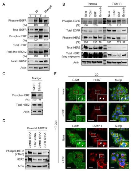 The following are available online at https://www.mdpi.com/article/10.3390/cancers13102331/s1. Figure S1: (A) The levels of phosphorylated EGFR and total EGFR were evaluated by Western blot of WCL of 5 µM erlotinib-treated and untreated parental JIMT1 cells cultured on a Matrigel matrix for 48 h, (B) The levels of total HER2 expression were examined in WCL of control and HER2 siRNA-treated parental JIMT1 cells, and control and EGFR siRNA-treated T-DM1R cells by Western blot analysis. (C) The levels of total EGFR expression were examined in WCL of control and HER2 siRNA-treated parental JIMT1 cells, and control and EGFR siRNA-treated T-DM1R cells by Western blot analysis. (D) The levels of phosphorylated EGFR (Y1045) and total EGFR expressions were examined in WCL of control and HER2 siRNA-treated parental JIMT1 cells, and control and EGFR siRNA-treated JIMT1-T-DM1R cells by Western blot analysis. Figure S2: Co-localization of T-DM1 and HER2 in cells cultured on the ECM proteins (ECM Gel and fibronectin) as additional controls to Matrigel. (A) Fluorescent immunostaining images showing T-DM1 and HER2 in parental JIMT1 cell-derived spheroids cultured on the ECM Gel for 3 days and treated with 100 µg/mL T-DM1 for 5 h. Scale bar: 20 µm. (B) Upper panels: Fluorescent immunostaining images showing T-DM1 and HER2 in parental JIMT1 cells cultured on fibronectin and treated with 100 µg/mL T-DM1 for 5 h. Scale bar: 50 µm. Lower panels: Fluorescent immunostaining images showing T-DM1 and LAMP-1 in parental JIMT1 cells cultured on fibronectin and treated with 100 µg/mL T-DM1 for 5 h. Scale bar: 50 µm. Figure S3: Unprocessed Western blot images for Figure 2A. Figure S4: Unprocessed Western blot images for Figure 2B.Figure S5: Unprocessed Western blot images for Figure 2C. Figure S6: Unprocessed Western blot images for Figure 2D. Figure S7: Unprocessed Western blot images for Figure 5D. Figure S8: Unprocessed Western blot images for Figure 5F and 5G. Figure S9: Unprocessed Western blot images for Figure S1A. Figure S10: Unprocessed Western blot images for Figure S1B–D.