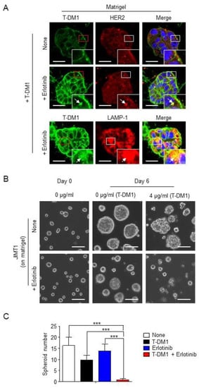 A primary trastuzumab-resistant breast cancer cell line JIMT1 and JIMT1-derived T-DM1-resistant cells (designated as T-DM1R) were maintained as described previously [12]. SKBR-3 cells were purchased from ATCC, and they were maintained in DMEM/F12 (1:1) media containing 10% FBS. T-DM1 and erlotinib were purchased from the pharmacy (Bethesda, NIH, Bethesda, MD, USA) and Selleckchem (Houston, TX, USA, cat# S1023), respectively. Matrigel matrix (Corning, NY, USA, cat# 354234) and ECM gel (Sigma-Aldrich, St. Louis, MO, USA, cat# E1207), both of which can support the cells to form spheroids on the gel, were prepared according to the manufacturers’ instructions. Briefly, vials of aliquoted Matrigel or ECM gel stored in at −20 °C were thawed on ice and the liquid Matrigel or ECM gel was immediately applied to 12-well (about 400 µL per well) or 6-well plates (about 600 µL per well). The dishes were incubated at 37 °C for 30 min until the Matrigel or ECM gel was polymerized.