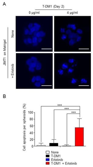 Blocking EGFR tyrosine kinase activation by erlotinib allows T-DM1 to induce apoptosis of JIMT1 cell spheroids on the Matrigel matrix. (A) Nuclear staining images showing parental JIMT1 cells cultured on a Matrigel matrix and treated with 4 µg/mL T-DM1, 5 µM erlotinib, T-DM1 + erlotinib, or left untreated. Images were taken on Day 3. Scale bar: 20 µm. (B) Cell apoptosis profiles in parental JIMT1 cell spheroids treated with 4 µg/mL T-DM1, 5 µM erlotinib, T-DM1 + erlotinib, or left untreated cultured on a Matrigel matrix. Data were collected on Day 3. Total 20 spheroids in each treatment were randomly picked up and examined. ***: p < 0.0001.