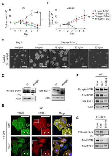 We next examined the functional correlation between EGFR activation and the sensitivity to T-DM1 in a different breast cancer cell line, SKBR-3, a HER2-positive breast cancer cell line that is very sensitive to T-DM1 [23]. As shown in Figure 5A, SKBR-3 cells were about 130 times more sensitive to T-DM1 than JIMT1 cells (IC50 for SKBR-3: 15 ng/mL versus IC50 for JIMT1: 2 µg/mL, data not shown). Almost all the cells died when incubated in cell culture media containing 15 ng/mL of T-DM1 for 4 days on the 2D culture system (Figure 5A). In contrast, in the Matrigel system SKBR-3 cells survived 6 days in the presence of 15 ng/mL of T-DM1 and grew and formed spheroid-like clusters (Figure 5B,C). These results demonstrate that