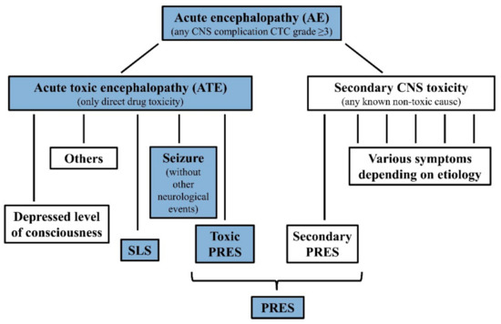 Boxes of studied phenotypes are highlighted with blue background. Note: symptoms of ATE subgroups may overlap, see definitions at Reference [26]. Further rare manifestations of ATE are not demonstrated in the Figure 1, e.g., ataxia, extrapyramidal movements, steroid evoked psychosis, etc. Secondary CNS toxicities may present with different, similar or same symptoms as ATE. E.g., PRES can be caused by hyponatremia or by severe hypertension, but may also present without these.