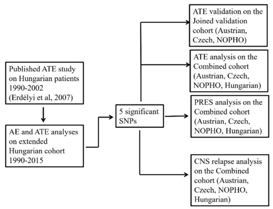 Following the 2007 publication, further Hungarian ALL patients were enrolled between 2005 and 2015. Sixty SNPs in 20 genes encoding drug-metabolizing enzymes and transporters were studied on the whole 1990–2015 Hungarian non-matched patient cohort (n = 580). To validate prior results, we organized a European case-control matched cohort with Austrian, Czech, and Nordic Society of Pediatric Hematology and Oncology (NOPHO) groups for validation of the ATE—genotype associations found in the Hungarian population (validation cohort: 107 ATE cases and 211 controls). SLS, seizure without other neurological events, toxic PRES, altered consciousness, and their overlap cases were requested, and two matched controls for each case. The same enrolment criteria were used for all of the study groups when selecting patients for the Joined validation cohort. In the same study, we also examined another AE phenotype, PRES, which included cases with toxic or secondary causes (82 PRES cases, 169 controls). Together, the four groups had enough cases to test for the effect of the same SNPs on CNS relapse, as well (86 CNS relapse cases (isolated or combined), 105 isolated bone-marrow (BM) relapse cases, 129 controls). The number of patients to be involved was designed based on the results of the discovery population with the statistical power of 0.8. For the demonstration of the study elements of CNS toxicity in a flow chart see Figure 1.