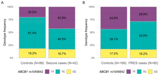 Genotype distributions of ABCB1 rs1045642 in seizure or PRES Combined cohorts. (A) Genotype frequencies between cases and controls regarding association of ABCB1 rs1045642 and seizure, (B) Genotype frequencies between cases and controls regarding association of ABCB1 rs1045642 and PRES. Colors refer to genotypes.