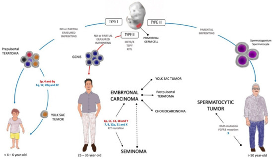 Type III TGCTs are represented by spermatocytic tumors and are more common in patients older than 50 years of age. They arise from differentiated spermatogonia, and the most important event in the oncogenesis appears to be the tumor-specific gain of chromosome 9 and, less frequently, mutations in HRAS and FGFR3 [8,23,31]. Figure 1 shows the etiopathogenesis of the three types of TGCTs.