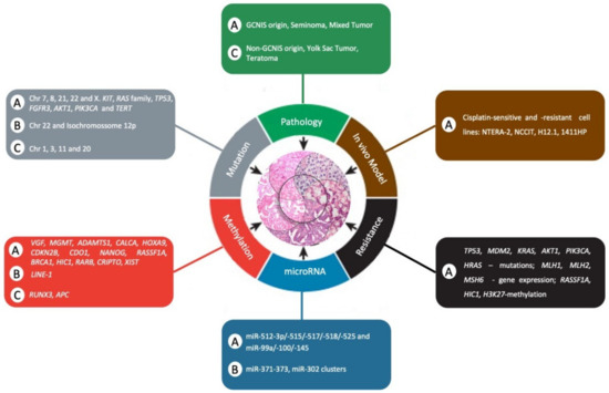 Recent studies have suggested an involvement of microRNAs (miRNAs) as tumor biomarkers and therapeutic targets. MiRNAs comprise a group of small (approximately 22 nucleotides) non-coding RNAs that regulate the expression of protein-coding genes by binding to their target messenger RNAs (mRNAs), thus resulting in translational repression or mRNA degradation [78,79]. Several studies have revealed the role of miRNAs in a variety of biological processes, including development, differentiation, viral infections, and cancer [80]. There are more than 1000 mature miRNAs [81] and some of them have been associated with malignant-GCTs as a new generation of biomarkers [19].