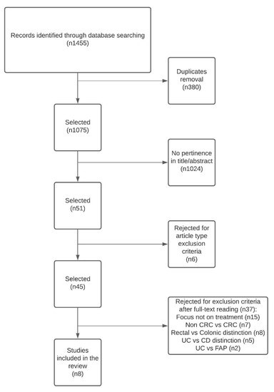 A systematic literature search was conducted according to the Preferred Reporting Items for Systematic Reviews and Meta-Analyses (PRISMA) statement (Figure 1). A systematic search of PubMed and Cochrane Library was conducted on 30 August 2020. Keywords used were a combination of the following terms “ulcerative colitis” OR “UC” OR Inflammatory bowel disease” or “IBD” AND “colorectal cancer” OR “colorectal adenocarcinoma” OR “rectal cancer” OR “rectal adenocarcinoma.” Any original paper in English concerning the treatment of rectal cancer in ulcerative colitis was included, inclusive of randomized controlled trials (RCTs), prospective controlled studies, retrospective case series and case reports. Exclusion criteria targeted original articles focusing on UC but not cancer or cancers different from CRC; articles including Crohn’s disease (CD) and not distinguishing between UC and CD; articles including colonic cancers and not distinguishing between the two (rectal and colonic) or not focusing on treatment; narrative review articles, video vignettes, letters, abstracts and conference proceedings. Two independent reviewers originally screened the literature and identified relevant articles. Duplicates were removed, and titles and abstracts were scrutinized for pertinence. Assessment of full papers permitted exclusion of other studies that did not meet inclusion criteria. Any discrepancy among reviewers was solved through discussion and consensus. References of all included articles were checked for additional paper identification. Considered endpoints were treatment modalities, operative strategies, functional and survival outcomes. Particular attention was given to early-stage, low rectal adenocarcinoma. Current national and international guidelines were reviewed critically. Findings are presented, explained and discussed.