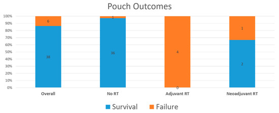 Radiotherapy (RT) is nowadays standard treatment for sporadic > T2 and/or N+ rectal cancer, especially in the neoadjuvant setting [23,26]. Radiotherapy has the same indication also in UC, although its use implies additional considerations. First, a higher risk of severe acute toxicity in patients with IBD has been reported, albeit with few long-term complications [27,28,29]. Secondarily, evidence for its use in patients who have undergone IPAA is limited to very few cases. Furthermore, a very high rate of pouch failure has been reported in the adjuvant setting due to the predictable effect of radiotherapy on the small bowel used for pouch reconstruction [6,7,8,9,10,25]. Finally, pouch failure is reportedly higher even when radiotherapy is given as neoadjuvant, but overall, the strong rationale and very low-quality evidence indicate that, when considering IPAA, neoadjuvant radiotherapy should be always preferred as the latest European Crohn and colitis organization guidelines indicate [8,10,13,30,31,32] (EL4). (Figure 1).