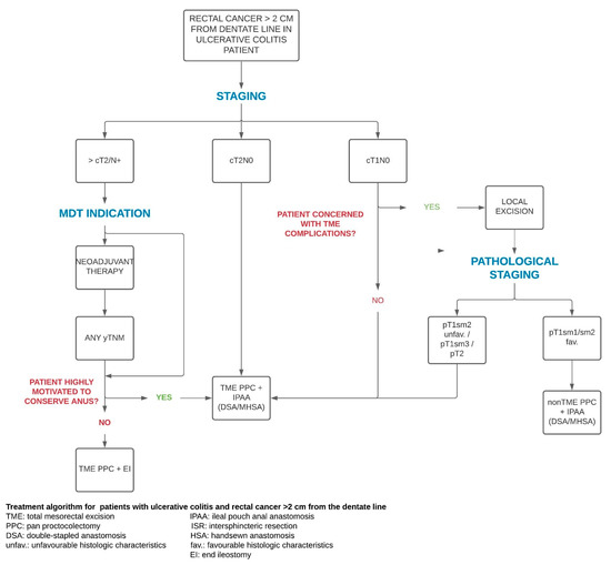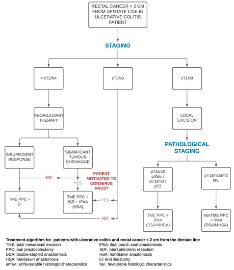 Treatment algorithm for patients with ulcerative colitis and rectal cancer < 2 cm from the pectinate line.