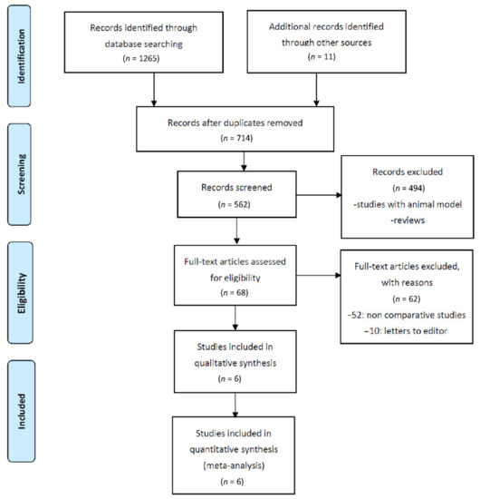 In total, 1276 records were initially retrieved from the computerized database search and manually checked. After the removal of duplicate records, 714 records were considered for review of the title and abstract. Of these, 82 records were selected as seemingly relevant publications. After assessment of the full text for eligibility, 68 records were further excluded because they were single-arm observation studies. Finally, six studies were included in the pooled analysis (Figure 1).