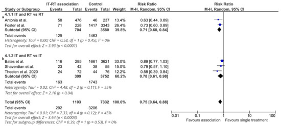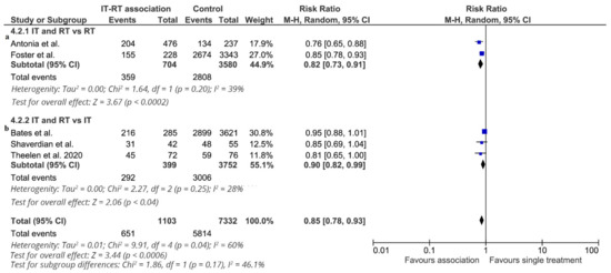 We performed several sensitivity analyses to help address the heterogeneity of the study design and patient populations. Because National Cancer Database studies were present, we conducted separate analyses according to the source of data (RCTs vs. other studies) and study quality. We also analyzed studies according to comparators (RT alone vs. ICI alone) and baseline stage patients (locally advanced vs. metastatic). Finally, other study-level characteristics (such as PD-L1 status and histology) were prespecified for the assessment of heterogeneity, using subgroup analysis.