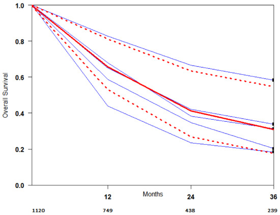 OS curve of studies included in the meta-analysis. Blue lines represent survival curves for each study. The red thick line represents the summarized survival curve with the 95% confidence bands (dashed lines) obtained using the approach of Combescure et al. with random effects.