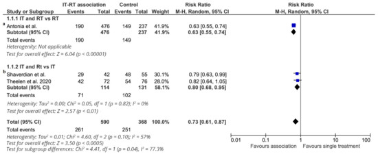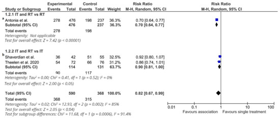 1-year progression-free survival. Meta-analysis of 3 studies of ICI-RT association: 1 study of ICI-RT vs. RT alone (a) and 2 studies of ICI-RT vs. ICI alone (b). The risk ratio (RR) and 95% confidence interval (CI) for the effect of treatment on 1-year progression-free survival are shown on a logarithmic scale. Studies are arranged by publication year. Theelen study is a pooled analysis of two RCTs.